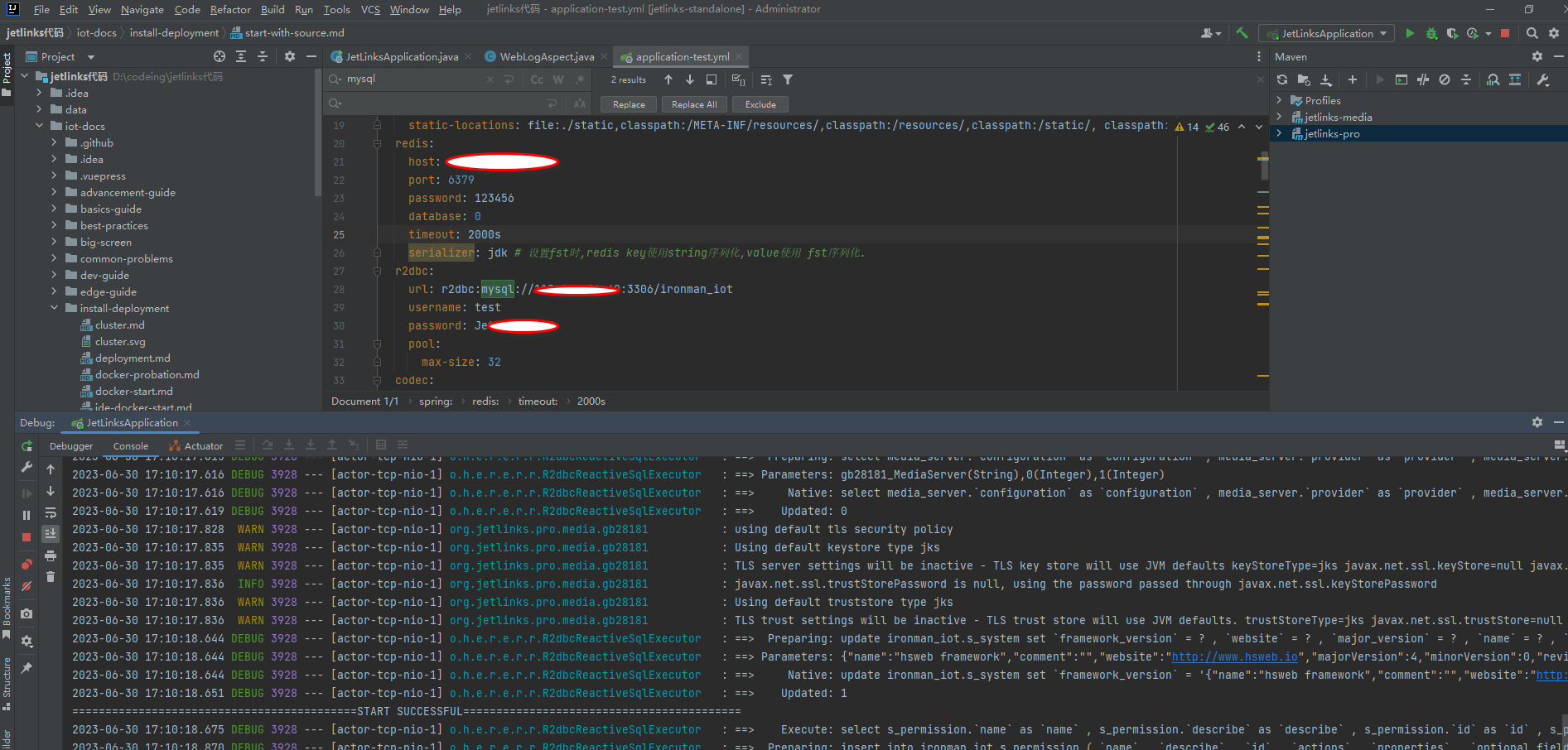 修改一下Redis、mysql的连接信息就可以运行起来,至于MQTT、kafka、clickhouse等后面逐步加上即可,考虑到便于debug寻找问题、本地资源有限,本文所有的组件均未单机版安装。