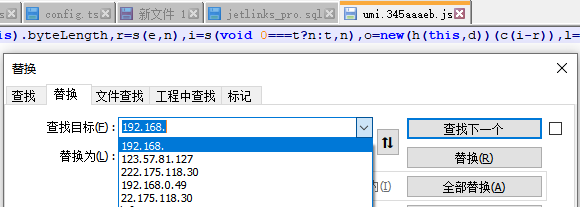 1.2 dist/umi.345aaaeb.js 这是一个压缩文件,我是先用sublime text文本编辑器直接整个文件夹查找ip,再进行修改。进行有几个ip需要修改,我是自接改成127.0.0.1,因为我是本地运行;总结的ip如下: