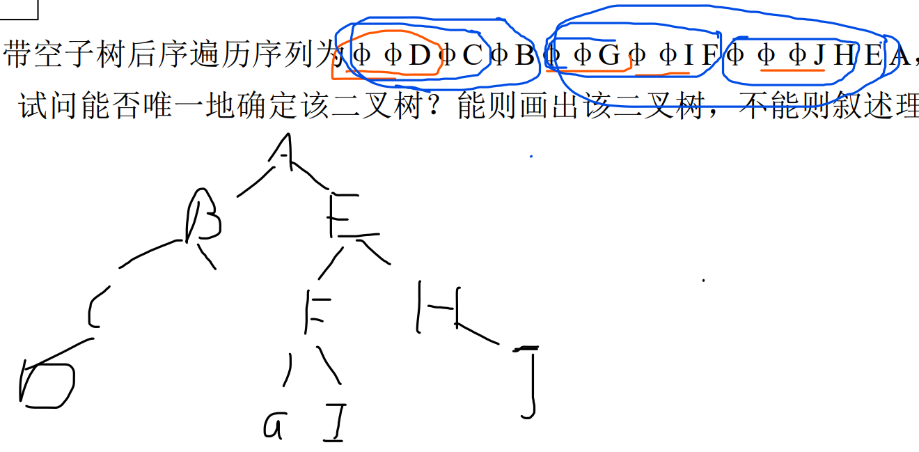 - 所以前序和后序能唯一的确定一棵树吗?肯定可以,我们只是需要补充信息,这就引出了扩展二叉树:用“#” “。”等表示空结点,遍历过程同时记录空结点,由于树的结点只有三种情况:n0表示叶子,扩展二叉树中必定在序列中和两个空符号紧邻,n1表示只有一个空结点,另一个有n0,n1,n2三种情况,那么如果我们已知了序列的头或尾,按照一定顺序从叶子开始处理,那么n1也就能确定了,这个样子逐层解读划分子树直到头尾。