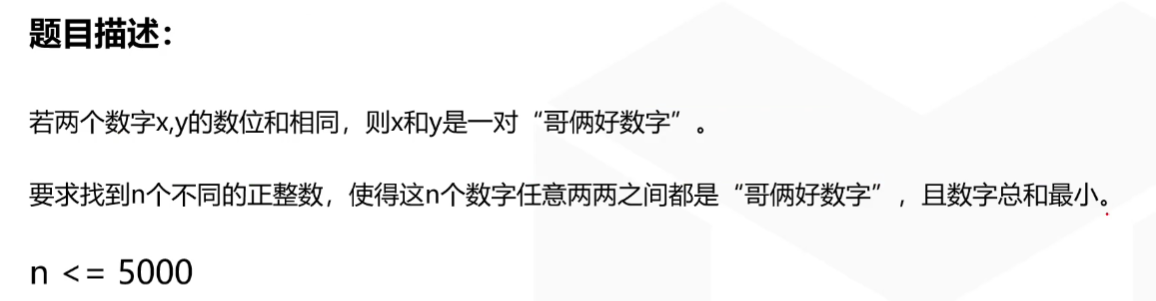 1 #include <iostream> 2 using namespace std; 3 4 long long f(int x ) 5 { 6 long long tot = 0; 7 while(x) 8 { 9 tot += x % 10; 10 x /= 10; 11 } 12 return tot; 13 } 14 15 int n , cnt[500]; 16 long long sum[500]; 17 long long ans = 1e18; 18 19 int main() 20 { 21 cin >> n ; 22 for(int i = 1; i<= 600000; i++) 23 { 24 int x = f(i); 25 if(cnt[x] < n ) 26 { 27 cnt[x]++; 28 sum[x] +=i; 29 30 } 31 if(cnt[x] == n ) 32 ans = min(ans, sum[x]); 33 34 } 35 printf("%lld",ans); 36 37 38 39 40 return 0; 41 }