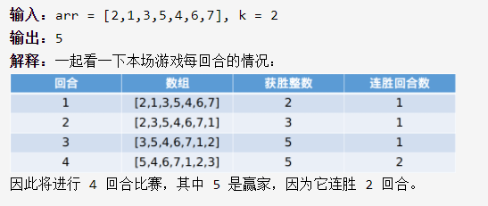 每回合比较数组前两个元素(arr[0]和arr[1]),较大的整数获胜并保留在位置0上。较小的整数则会移到数组的末尾。当一个整数赢得k个连续回合后。游戏结束,这个整数就是最后的赢家。