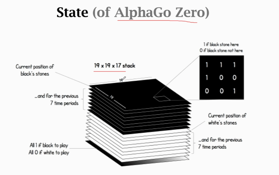 第一版本的AlphaGo是用的19 *19 *48的tensor,而在最新的AlphaGo zero用的则是19 *19 *17的tensor,由于AlphaGo zero更好解释,因此用的是此版本