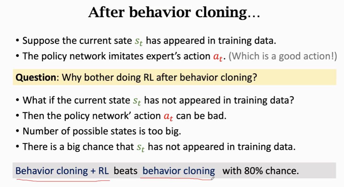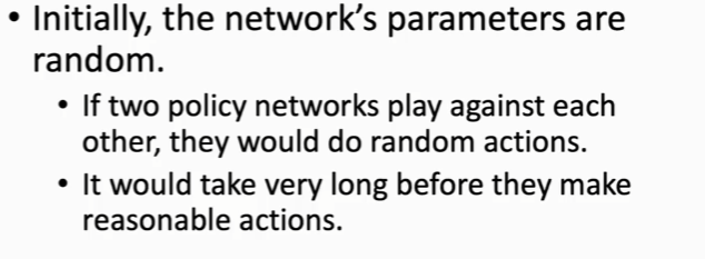 在做完behavior cloning,我们就可以用神经网络来进行对战了,他们对于在记录的棋谱中出现过了的状态是可以做出很好的回应动作的,但是对于棋谱中没有出现过的情况,就可能会做出很差的回应,以至于错误累加会导致越来越差,所以还需要进行强化学习来加强神经网络。