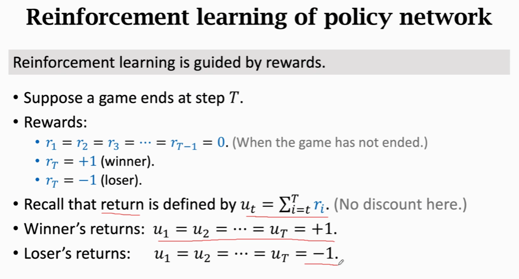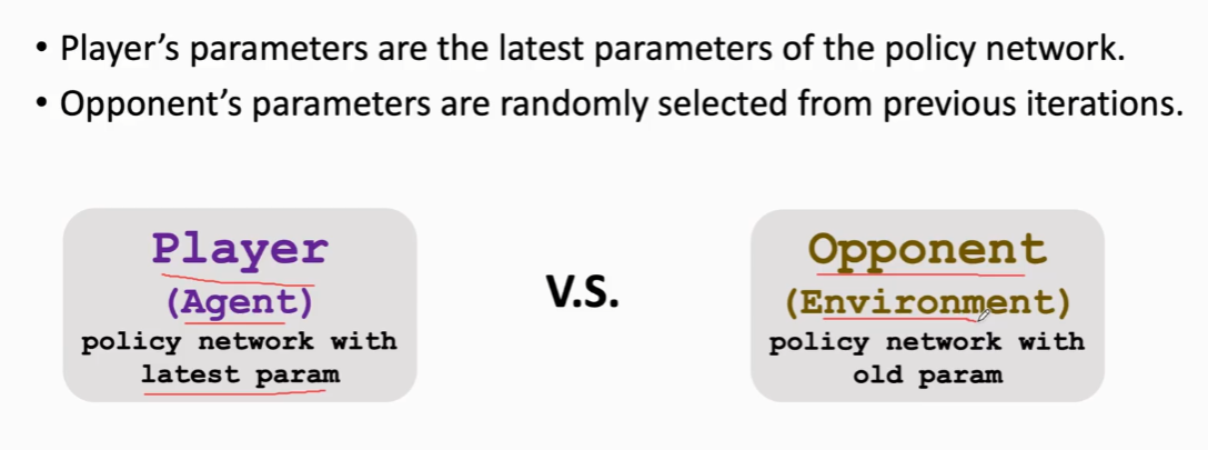 player用的是策略网络的最新的模型参数,而opponent则是从旧的参数中随机选的,每下完一局围棋,用胜负来当做奖励,以此来更新player的参数。