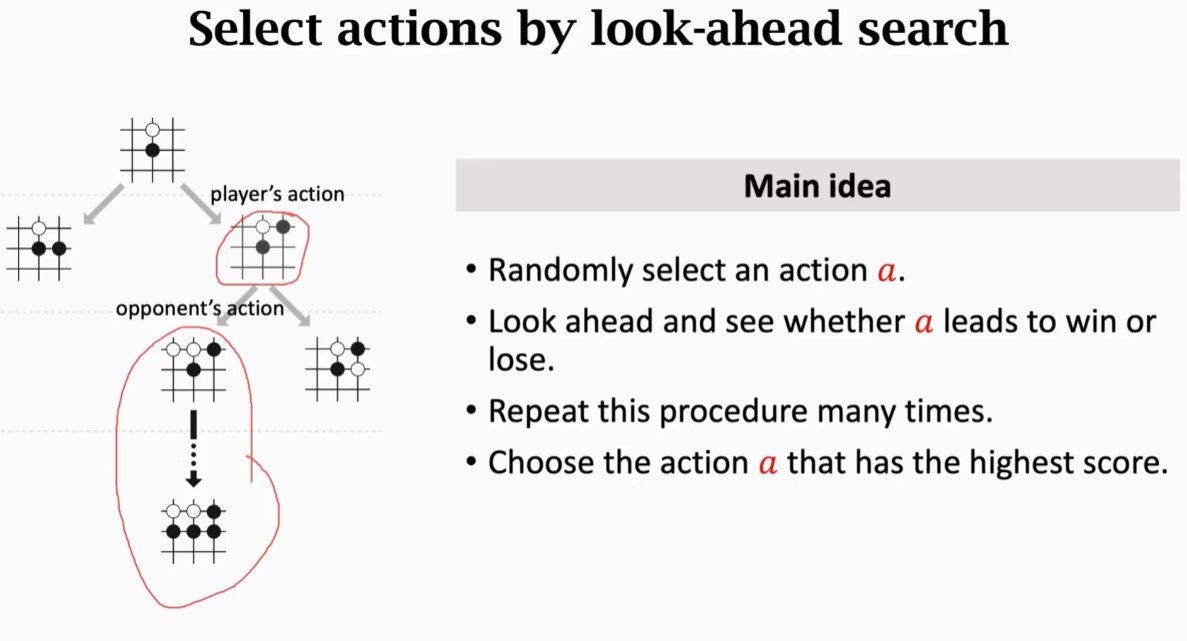 主要思想:随机抽样选择一个动作a,然后往前看直到赢或者输,执行很多次,选择评分最高的动作a