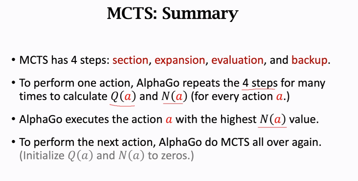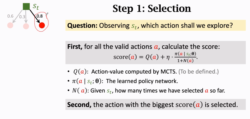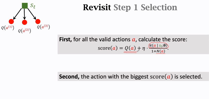 - 另外一个是策略函数π给动作a打的分数/1+N(a) 其中N(a)是动作a被选中的次数(这项是为了避免重复探索动作a,因为a被选中的次数多,分母1+N(a)就会变大,从而降低分数价值) η是超参数,手动调节