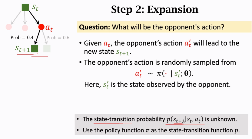 根据第一步选出的动作,第二步则是猜想一下对手会做出什么样的动作,这里通过策略网络选出动作a't来模拟对手做出应对的动作。因为是推测的对手行动,所以也就可以用策略网络随机抽样得到的动作来代替认为是对手做出的动作,也就是可以用策略函数π来代替状态转移函数。