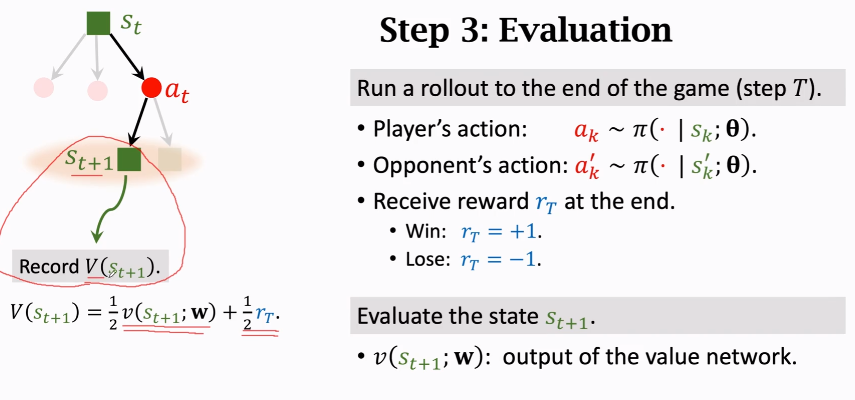 从第二步得到的状态 s_t+1开始,就让策略网络做自我博弈,即双方都由策略网络控制,直到游戏结束。(叫做 fast rollout),根据胜负来获得奖励值rt