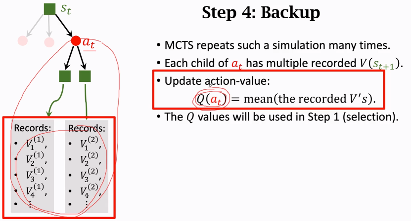 由于这个过程会进行很多次,因此对于一个点a_t下面会对应有很多个记录,我们将a_t下面的所有的记录做一个平均作为a_t新的价值——Q(a_t)(因为当前点下所有的值都反应了这个点可能存在的好坏,因此这里用平均值来反应这个点的好坏)