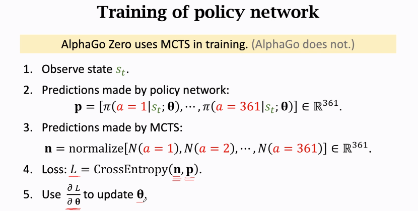 - 比较预测和真实落子位置,并记为loss