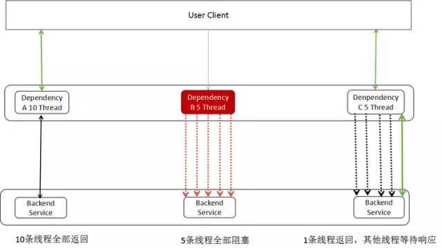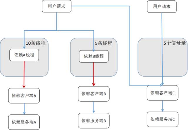 线程池隔离和信号隔离的区别见下图,使用线程池隔离,用户请求了15条线程,10条线程依赖于A线程池,5条线程依赖于B线程池;如果使用信号量隔离,请求到C客户端的信号量若设置了15,那么图中左侧用户请求的10个信号与右边的5个信号量需要与设置阈值进行比较,小于等于阈值则执行,否则直接返回。