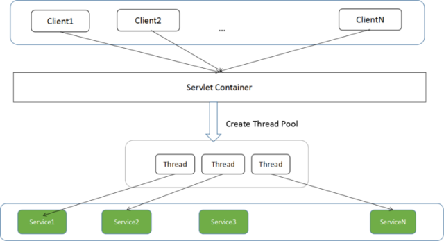 我们先来看一个分布式系统中常见的简化的模型。Web服务器中的Servlet Container,容器启动时后台初始化一个调度线程,负责处理Http请求,然后每个请求过来调度线程从线程池中取出一个工作者线程来处理该请求,从而实现并发控制的目的。
