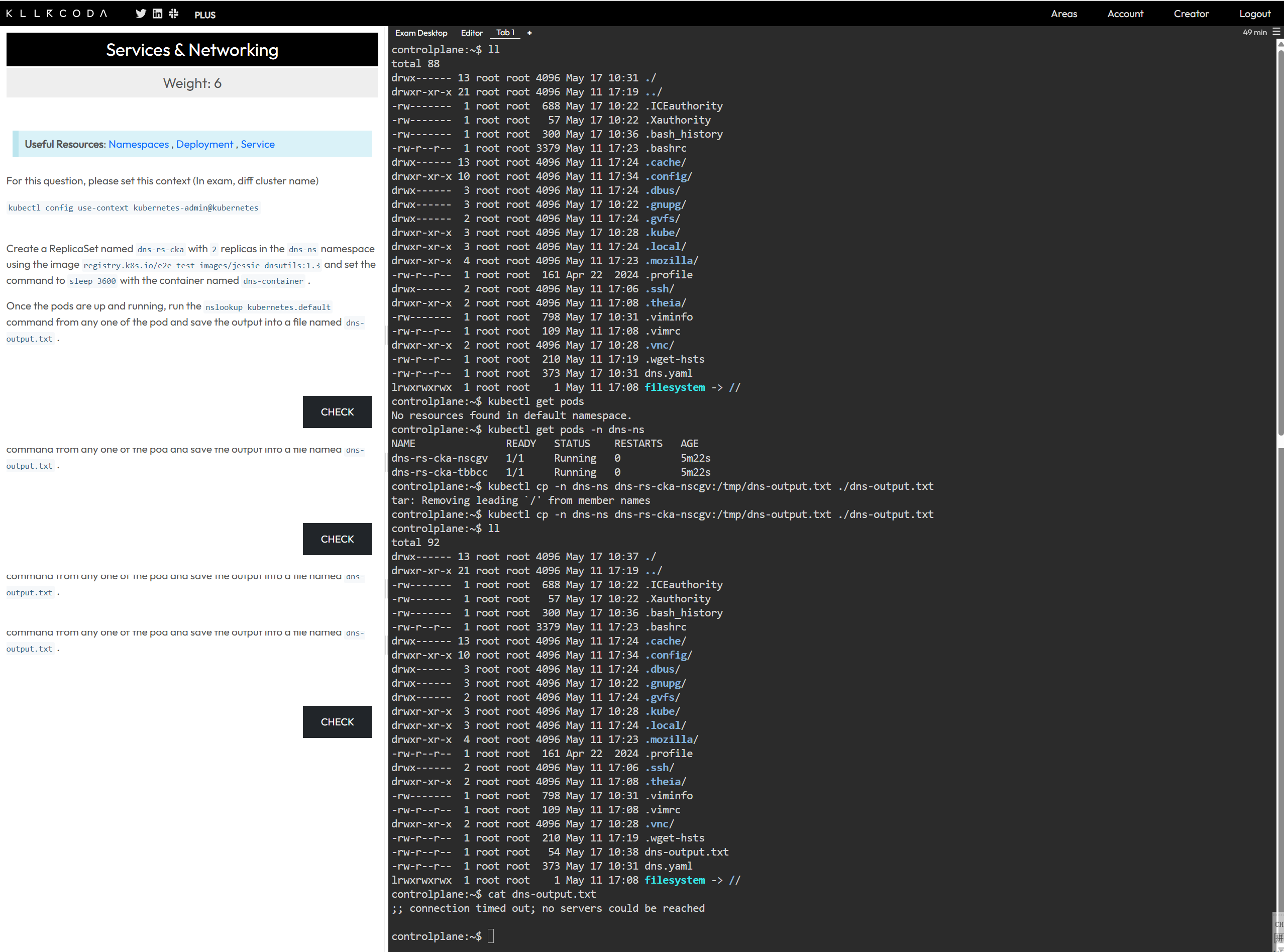 dns-ns命名空间创建一个名为dns-rs-cka的 ReplicaSet,包含 2 个副本。 - 使用镜像