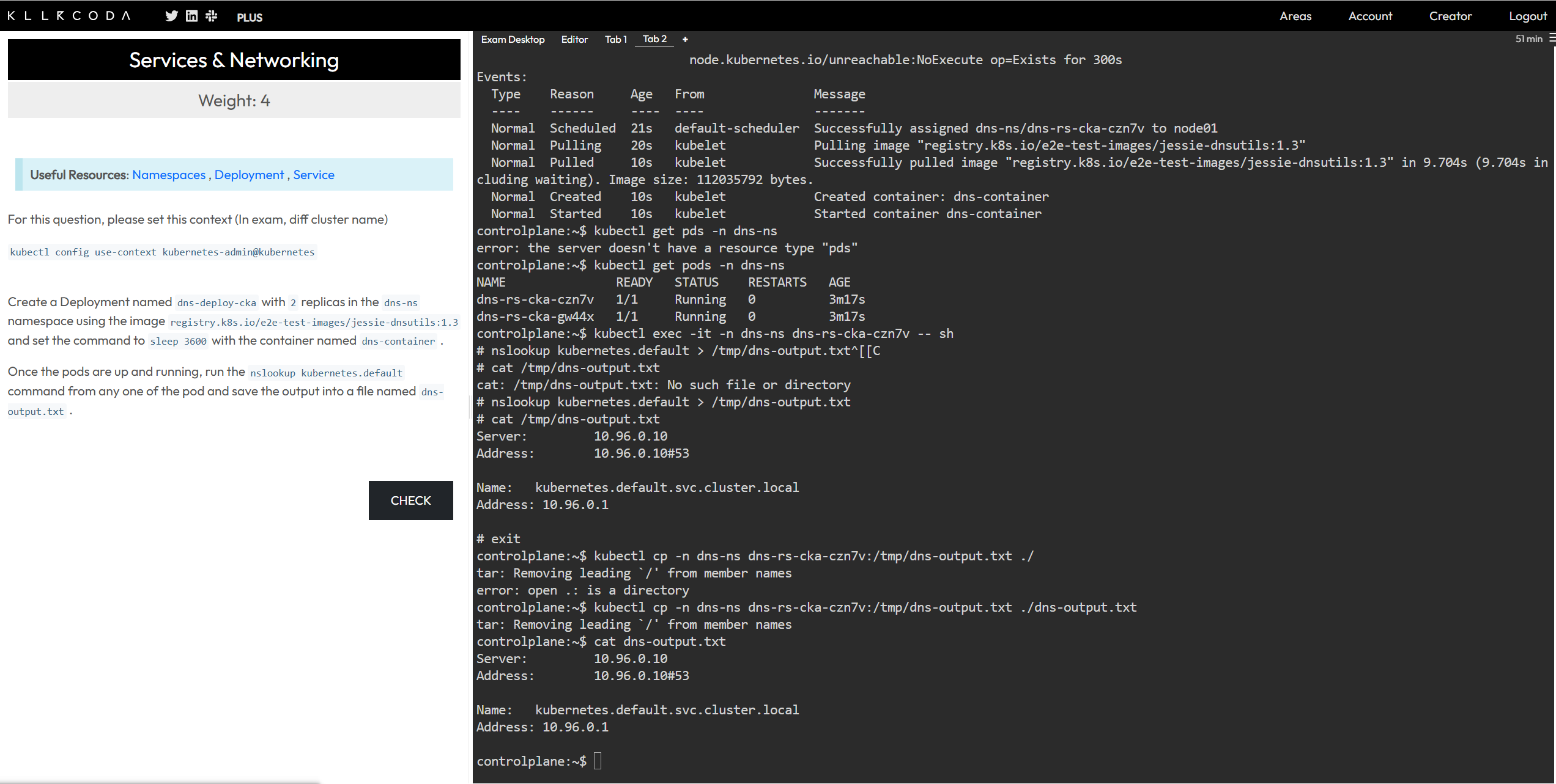 nslookup kubernetes.default > /tmp/dns-output.txt - 退出 Pod: