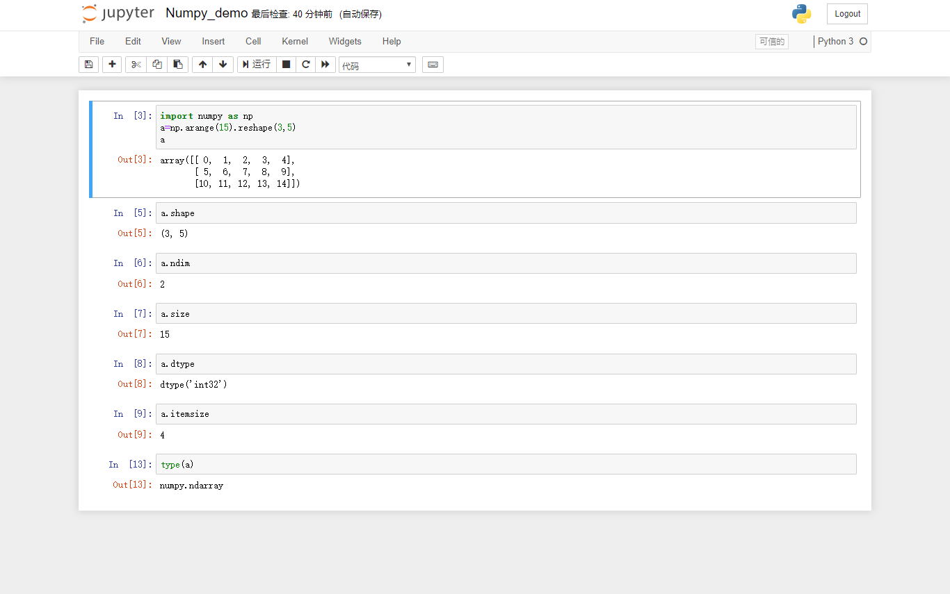 shape的元素的乘积。 - ndarray.dtype - 一个描述数组中元素类型的对象。可以使用标准的Python类型创建或指定dtype。另外NumPy提供它自己的类型。例如numpy.int32、numpy.int16和numpy.float64。