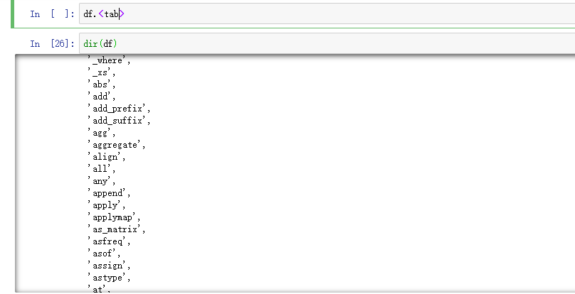 IPython支持 tab 键自动补全列名与公共属性(也可以使用dir列出)。下面是部分可自动补全的属性: