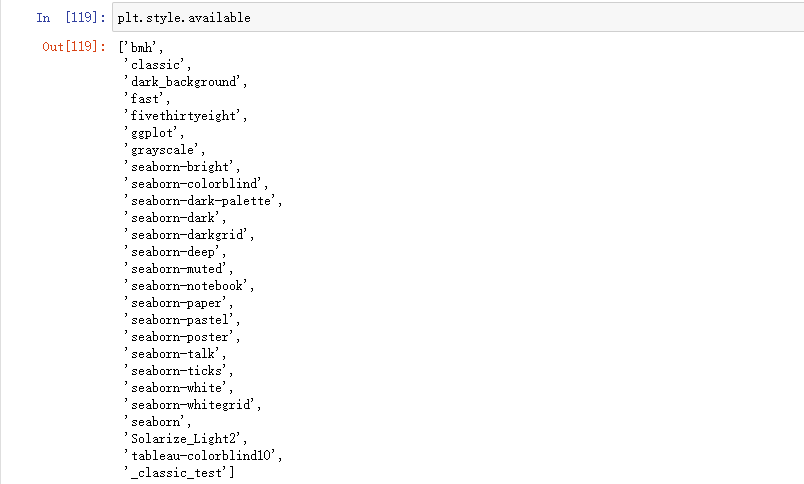 Matplotlib中提供了许多样式,以使您可以根据需要定制可视化。要查看样式列表,可以使用 style。