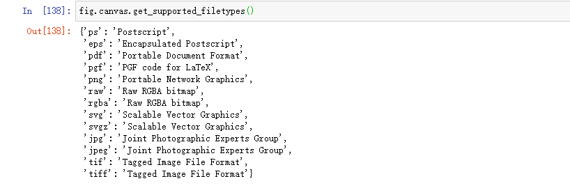 现在我们对绘图的结果感到满意,我们希望将其保存到磁盘。我们可以在Matplotlib中保存许多文件格式。要查看可用选项的列表,请使用: