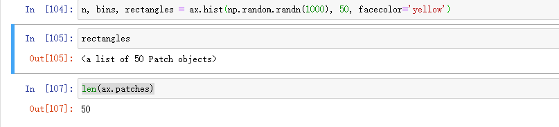 同样,创建补丁的方法(例如 bar()创建矩形列表)会将补丁添加到Axes.patches列表中: