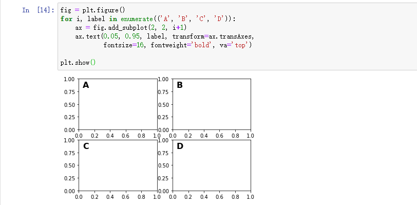 在数据坐标系之后,轴可能是第二有用的坐标系。这里的点(0,0)是轴或子图的左下角,(0.5,0.5)是中心,而(1.0,1.0)是右上角。您还可以参考超出范围的点,因此(-0.1,1.1)位于轴的左侧和上方。在坐标轴中放置文本时,此坐标系统非常有用,因为您经常需要在固定位置(例如坐标轴窗格的左上角)放置文本气泡,并在平移或缩放时使该位置保持固定。这是一个简单的示例,该示例创建四个面板并将其标记为“ A”,“ B”,“ C”,“ D”,就像您在期刊中经常看到的那样。