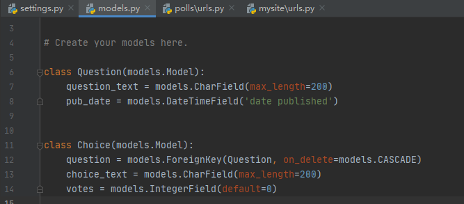 这些概念由Python类表示。编辑 polls/models.py文件,使其如下所示: