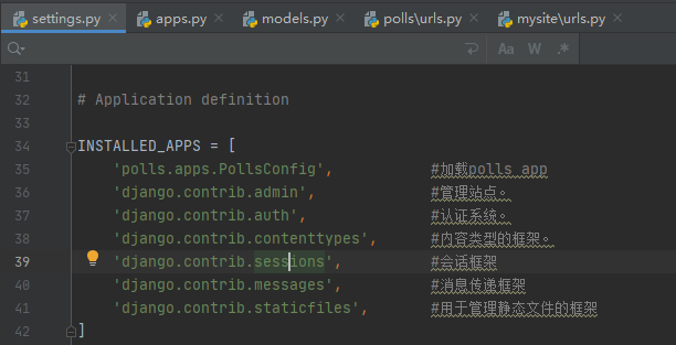 另外,请注意INSTALLED_APPS文件顶部的设置。该名称包含在此Django实例中激活的所有Django应用程序的名称。应用程序可以在多个项目中使用,您可以打包和分发这些应用程序,以供其他人在其项目中使用。