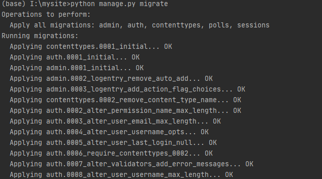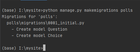 迁移是Django存储对模型(以及数据库模式)所做更改的方式-它们是磁盘上的文件。如果愿意,您可以阅读新模型的迁移;这是文件polls/migrations/0001_initial.py。不用担心,您不会期望每次Django都读入它们,但是如果您想手动调整Django的更改方式,则可以对它们进行人工编辑。