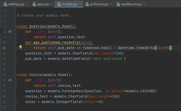 在我们的民意调查应用中,我们将创建两个模型:Question和Choice。