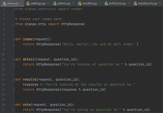 现在让我们向添加更多视图polls/views.py。这些视图略有不同,因为它们采用了一个参数: