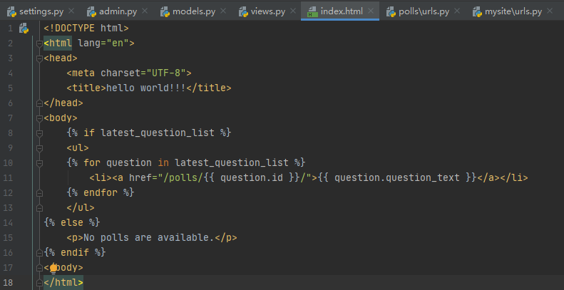 在templates您刚创建的目录中,创建另一个名为的目录polls,并在其中创建一个名为的文件 index.html。换句话说,您的模板应位于 polls/templates/polls/index.html。由于app_directories 模板加载器的工作方式如上所述,您可以在Django中将此模板称为polls/index.html。
