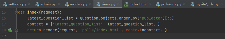当有人从您的网站请求页面时,例如“ / polls / 34 /”,Django将加载mysite.urlsPython模块,因为该ROOT_URLCONF设置指向该模块 。它找到名为的变量urlpatterns 并按顺序遍历模式。在找到匹配项之后'polls/',它将剥离匹配的文本("polls/"),并将其余文本–发送 "34/"到'polls.urls'URLconf进行进一步处理。在那里匹配'<int:question_id>/',从而导致对detail()视图的调用,如下所示:
