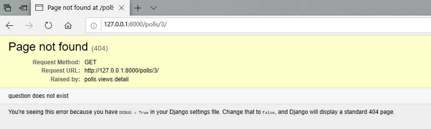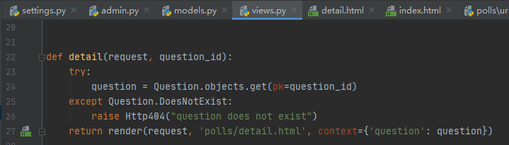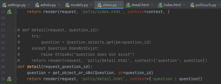 如果对象不存在,则使用get() 和引发它是一个非常常见的习惯用法Http404。Django提供了一个快捷方式。这是detail()重写的视图: