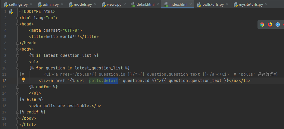 如果您想将民意调查详细信息视图的URL更改为其他内容,或者更改为类似内容,polls/specifics/12/而不是在一个或多个模板中进行更改,则可以在polls/urls.py以下位置进行更改: