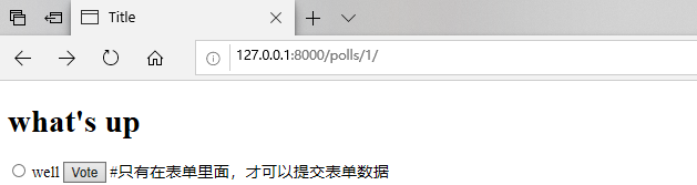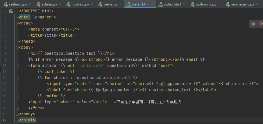 更新民意调查详细信息模板(“ polls / detail.html”),以便该模板包含一个HTML <form>元素: