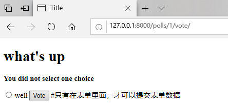 request.POST['choice']KeyError如果choice未在POST数据中提供。上面的代码检查KeyError并重新显示带有错误消息的问题表单(如果choice未给出)。 -
