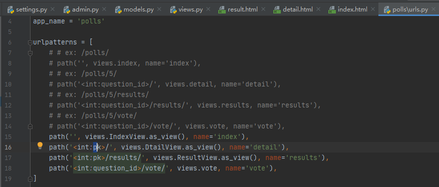 首先,打开polls/urls.pyURLconf并按如下所示进行更改: