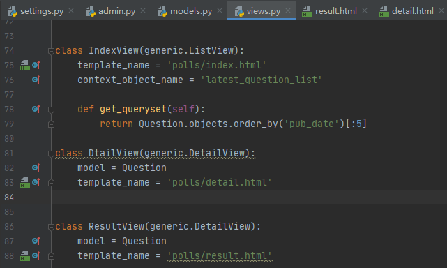 接下来,我们将删除我们的老index,detail和results 视图,并使用Django的通用视图代替。为此,请打开 polls/views.py文件并按如下所示进行更改: