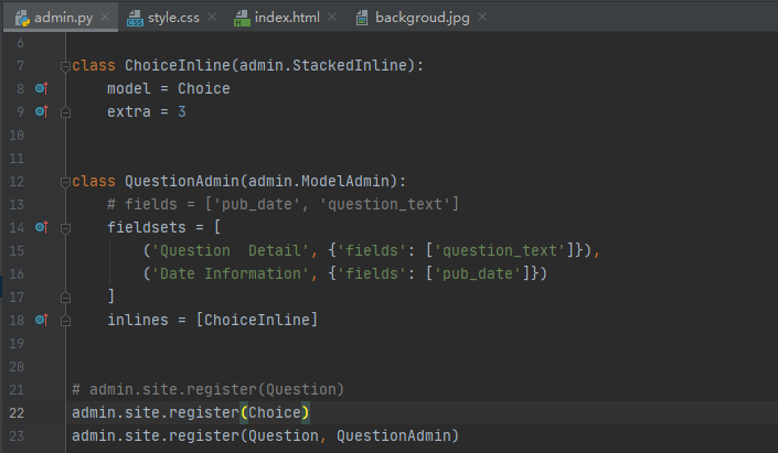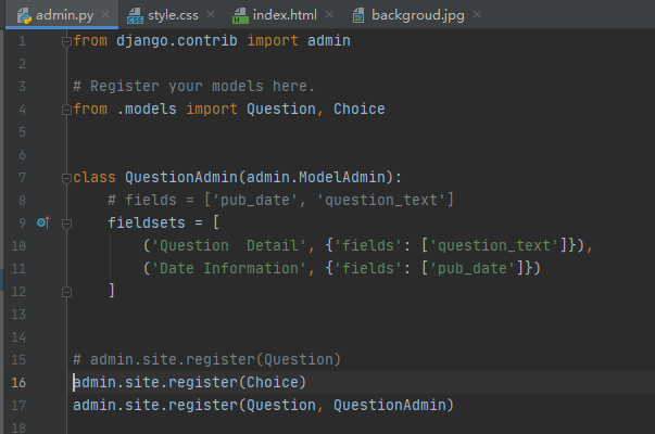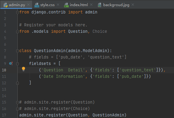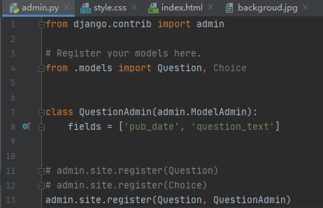 让我们通过重新排列编辑表单中的字段来查看其工作原理。将admin.site.register(Question)行替换为: