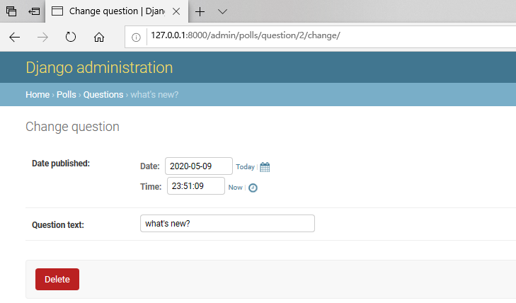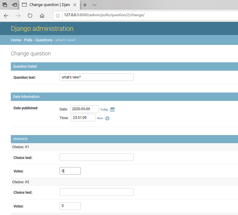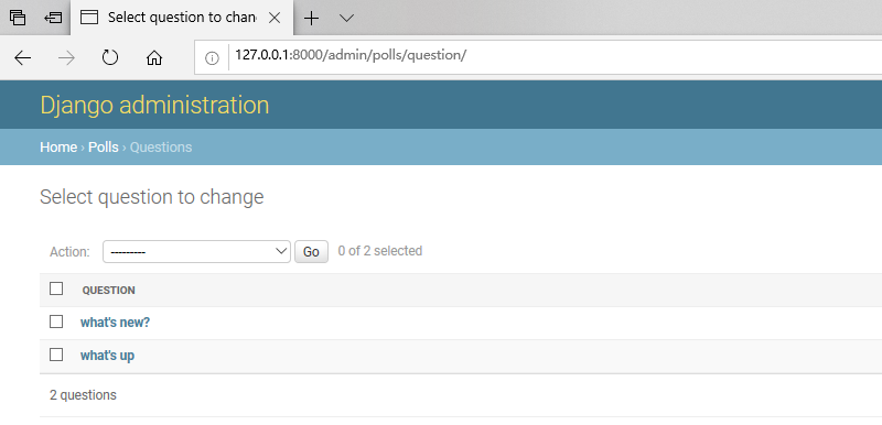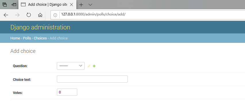 以这种形式,“问题”字段是一个选择框,其中包含数据库中的每个问题。Django知道ForeignKey应在admin中将a表示为一个<select>框。在我们的情况下,此时仅存在一个问题。