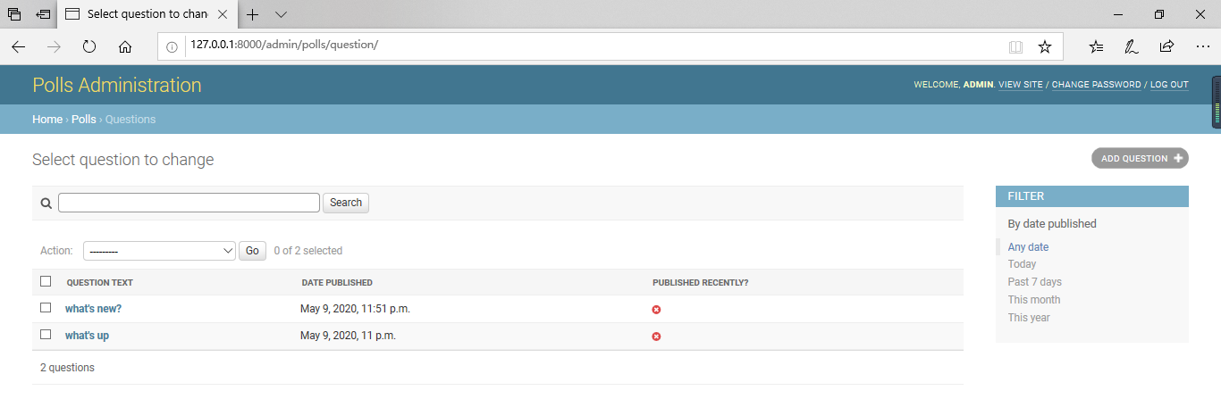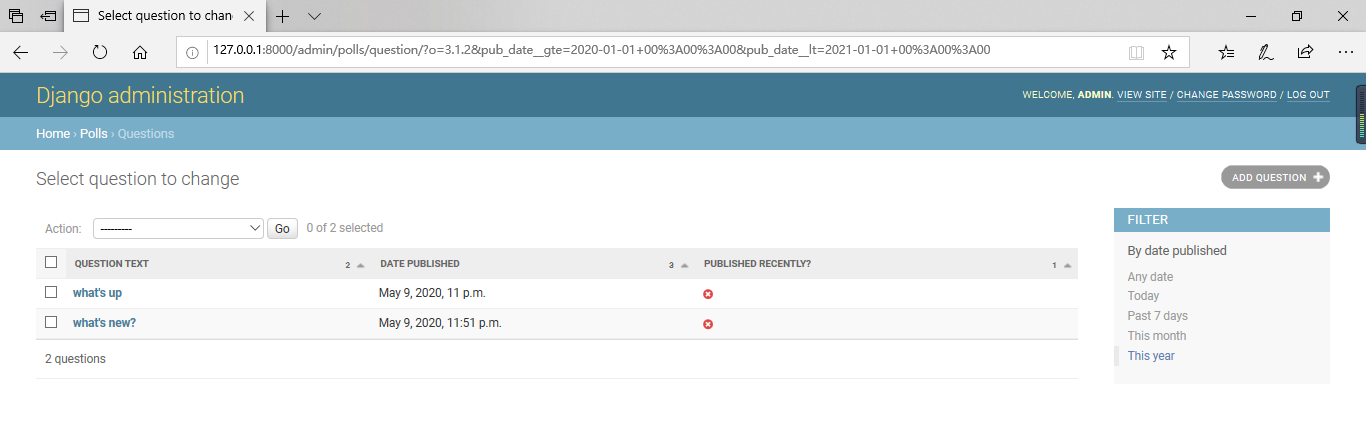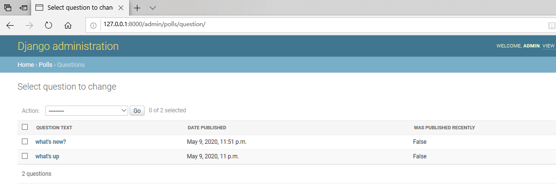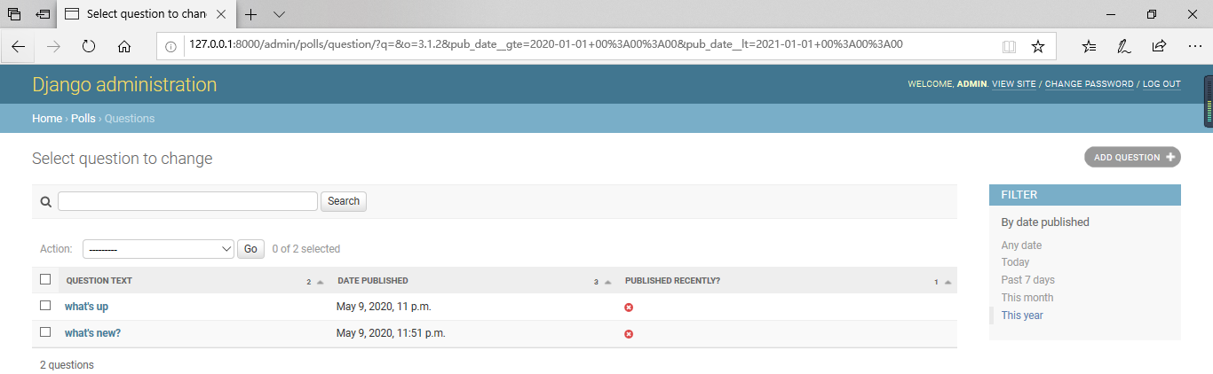 您可以单击列标题以这些值进行排序-标题除外was_published_recently,因为不支持按任意方法的输出进行排序。还要注意,was_published_recently默认情况下,for的列标题 是方法的名称(下划线用空格替换),并且每一行都包含输出的字符串表示形式。