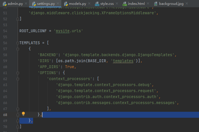 打开设置文件(mysite/settings.py,请记住),然后DIRS在TEMPLATES设置中添加一个 选项: