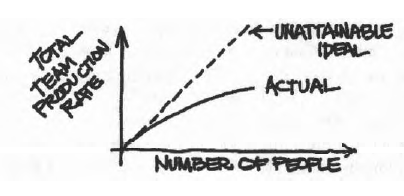 理想的人员安排是这样:在项目的的大部分时间里由小型核心团队来做设计工作,在开发的最后阶段(时间安排的最后1/6)加入大量的人手。 (这是建立在有真正的详细设计的前提下,此时的工作只是按照完善可用的设计进行代码翻译而已)
