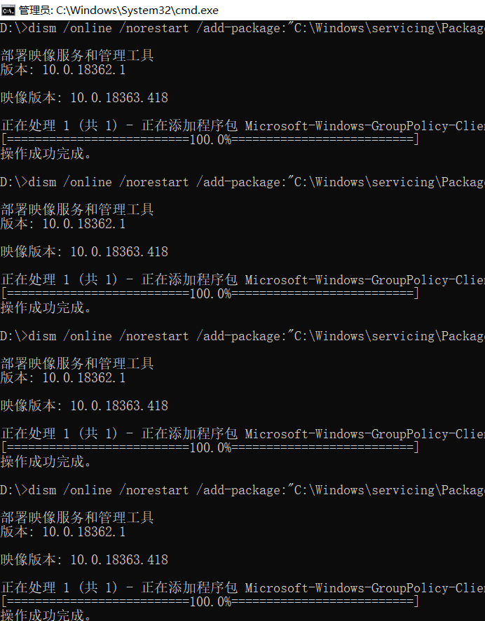 @echo off set fileName=policy.txt :: 获取依赖的软件信息 dir /b %systemroot%\servicing\Packages\Microsoft-Windows-GroupPolicy-ClientExtensions-Package~3*.mum >%fileName% dir /b %systemroot%\servicing\Packages\Microsoft-Windows-GroupPolicy-ClientTools-Package~3*.mum >> %fileName% :: 通过dism安装依赖软件 for /f %%i in ('findstr /i . %fileName% 2^>nul') do dism /online /norestart /add-package:"%systemroot%\servicing\Packages\%%i" pause