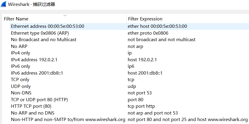 抓包过滤器类型Type(host、net、port)、方向Dir(src、dst)、协议Proto(ether、ip、tcp、udp、http、icmp、ftp等)、逻辑运算符(&& 与、|| 或、!非)