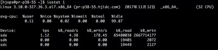 如果我们有大量的 io 操作的话通过 iostat 监控 io 的写入和读取的数据量,同时也能看到在 io 负载特别大的情况下 cpu 的平均负载情况。