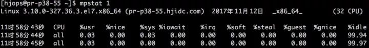 我这是一个 32 core 的压测服务器,通过 mpstat 可以监控每一个虚拟处理器的负载情况。也可以查看总的处理器负载情况。