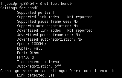 排除 127.0.0.1 的适配器外,还有三个适配器信息,只有第一个 bond0 才是我们正在使用的,然后使用 ethtool 查看当前 bond0 的详细适配器信息。重点关注下 speed 域,它表示当前网络适配器的带宽。