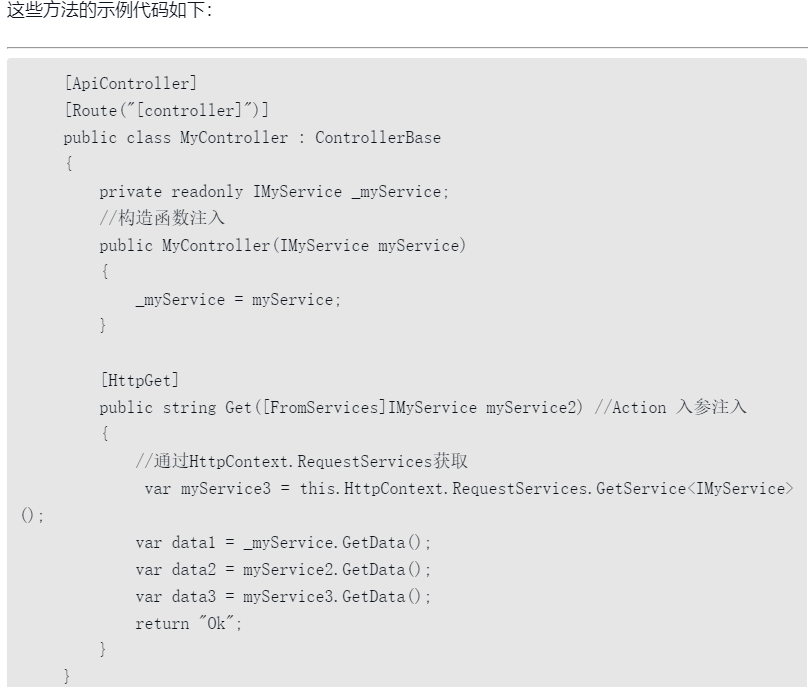 在controller中获取服务:使用构造函数参数;·使用HttpContext.RequestServices属性。·使用FromServicesAttribute标注Action的入参。
