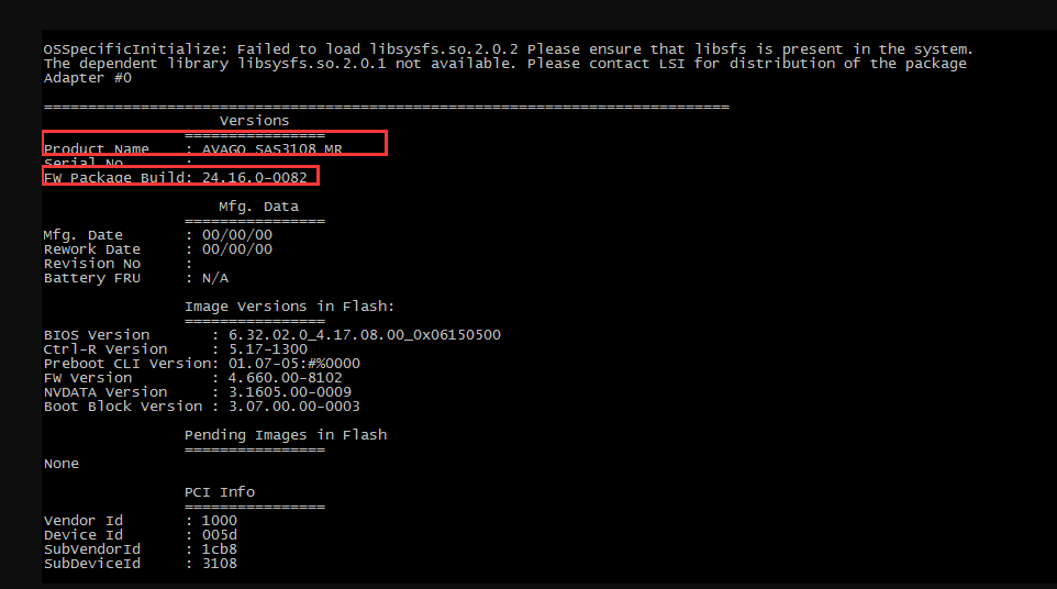 可以看到我们的阵列卡是AVAGO SAS3108,固件版本号为24.16.0-0082