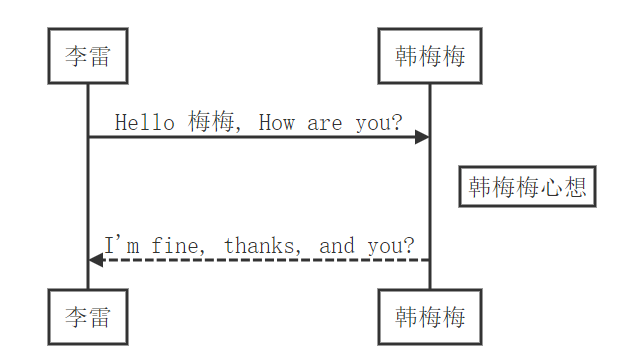 李雷 -> 韩梅梅: Hello 梅梅, How are you?